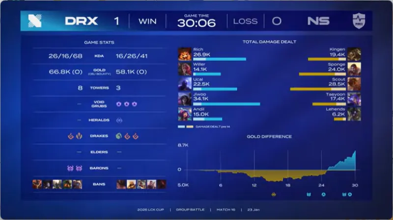 虎扑01月23日讯 【GAME1】DRX蓝色方,NS红色方